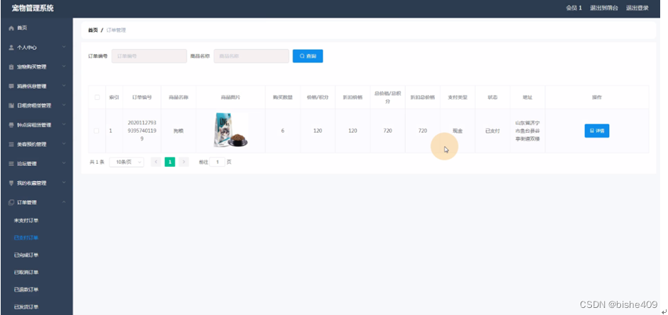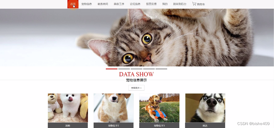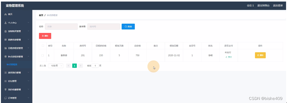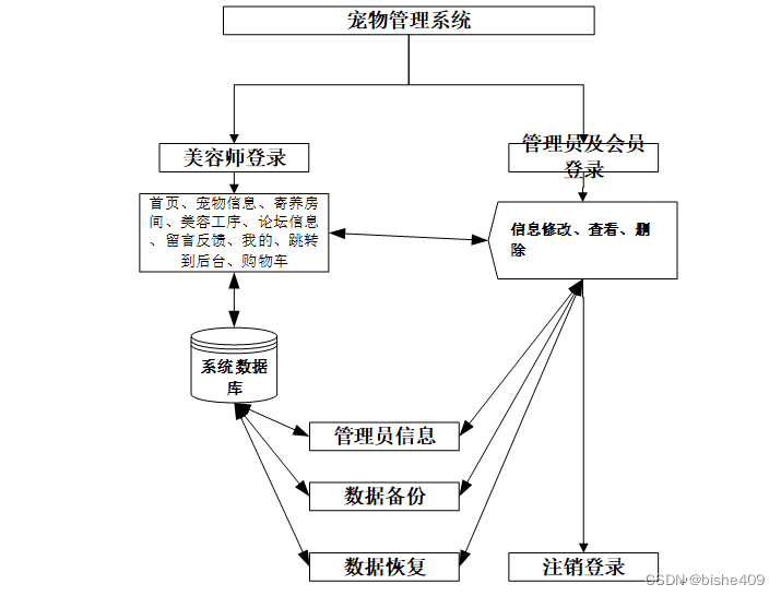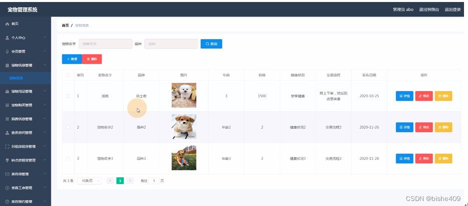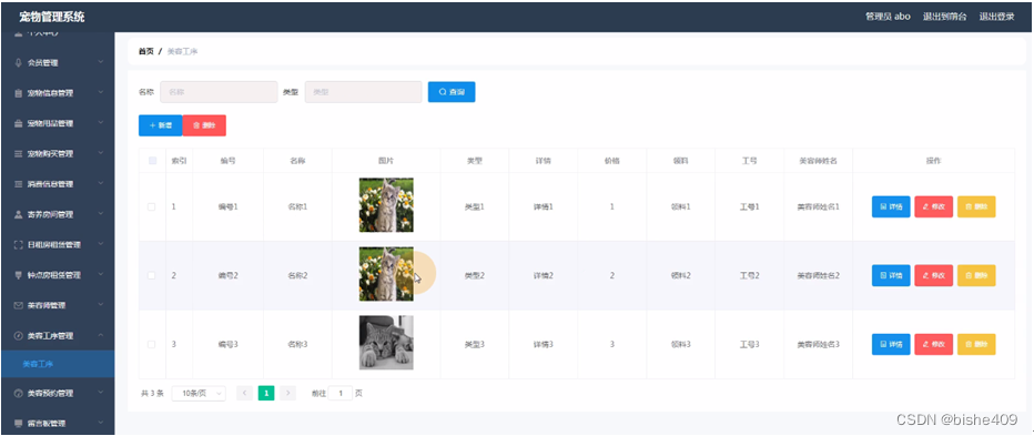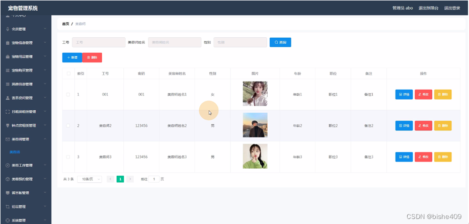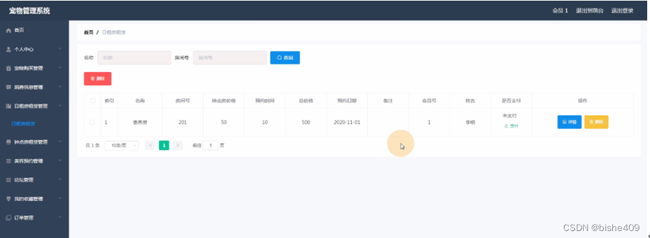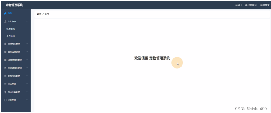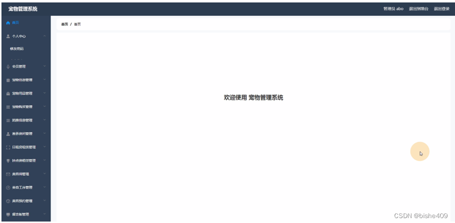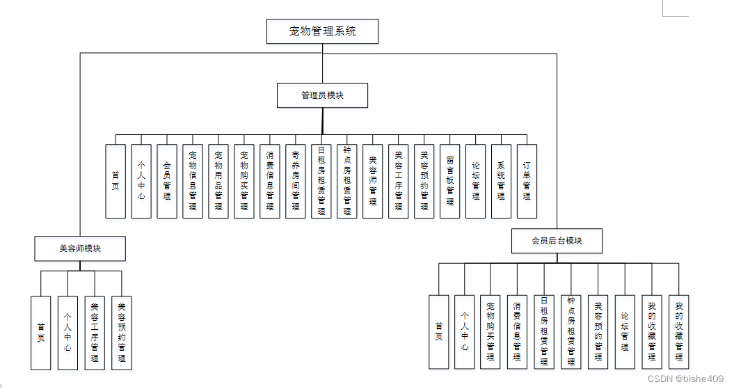 模块包括首页、个人中心、会员管理、宠物信息管理、宠物用品管理、宠物购买管理、消费信息管理、寄养房间管理、日租房租赁管理、钟点房租赁管理、美容师管理、美容工序管理、美容预约管理、留言板管理、论坛管理、系统管理、订单管理等进行相应的操作。