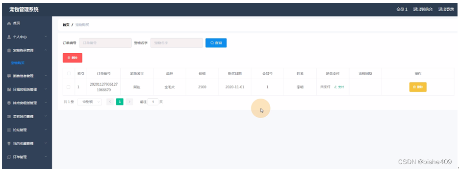 宠物购买管理:通过列表可以获取索引、订单编号、宠物名字、品种、价格、购买日期、会员号、姓名、是否支付、审核回复等信息进行删除操作,如图5-9所示。