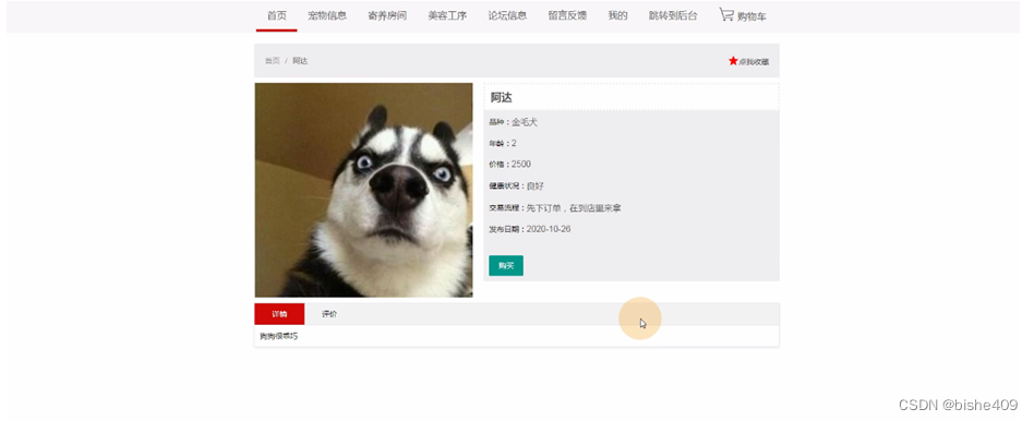 宠物信息:通过页面可以获取宠物名称、品种、年龄、图片、价格、健康状况、交易流程、发布日期、详情等信息,进行评价、购买或收藏操作,如图5-4所示。
