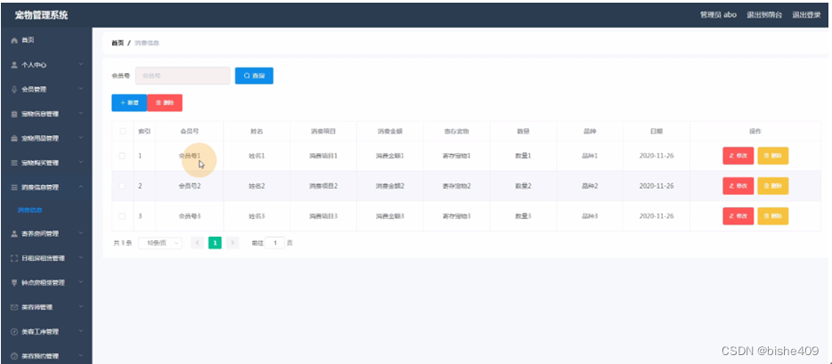 消费信息管理:管理员通过列表可以获取索引、会员号、姓名、消费项目、消费金额、寄存宠物、数量、品种、日期等信息,进行修改或删除操作,如图5-19所示。