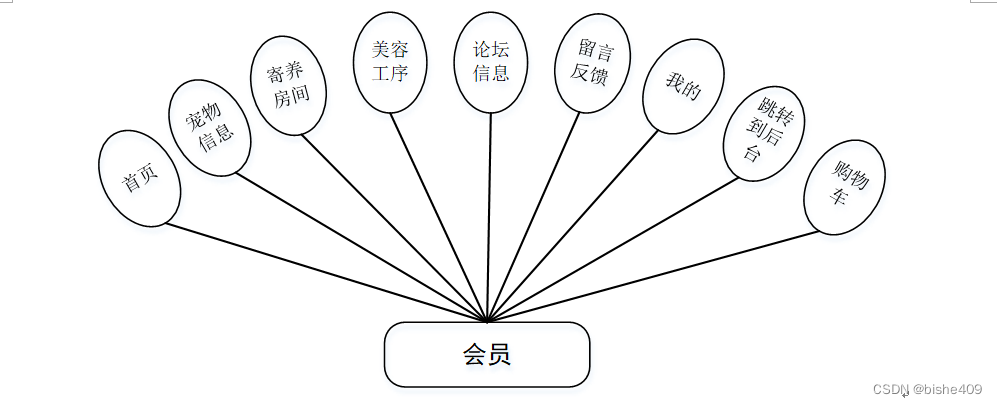 会员注册登录后可进行首页、宠物信息、寄养房间、美容工序、论坛信息、留言反馈、我的、跳转到后台、购物车,会员用例如图3-2所示。