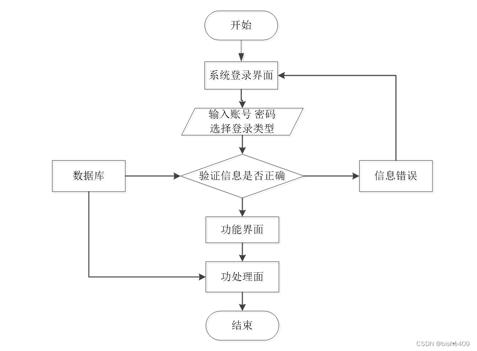 用户想进入系统,首先进入系统登录界面,通过正确的用户名、密码,选择登录类型登录,系统会检查登录信息,信息正确,然后输入相应的功能界面,提示信息错误,登录失败。系统操作流程如图3-5所示。