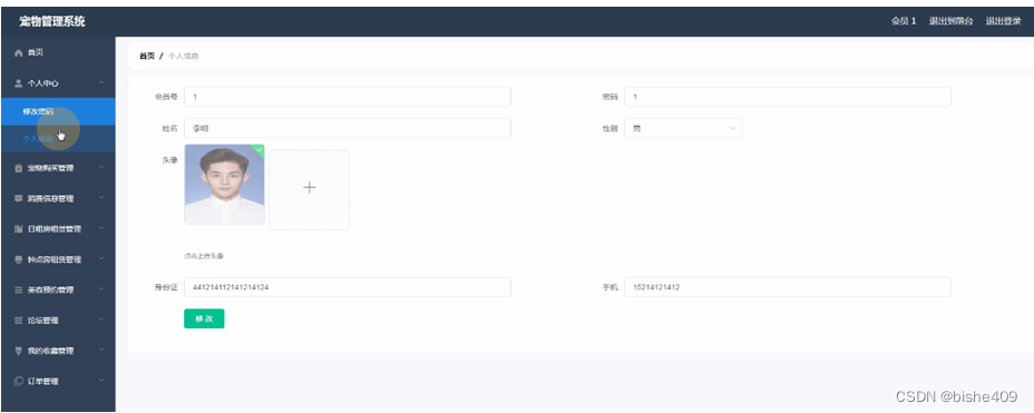个人中心:通过个人中心在页面通过填写会员号、密码、姓名、性别、头像、身份证、手机等信息进行修改,如图5-8所示。