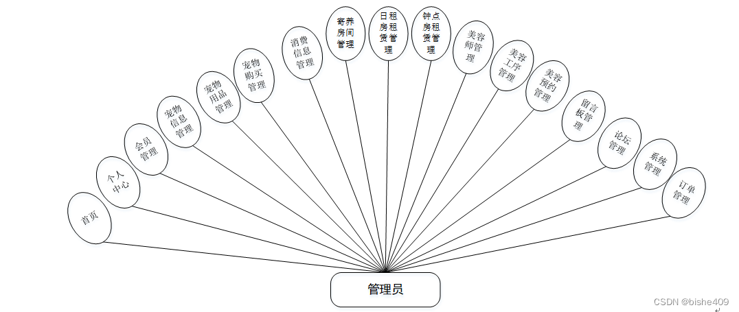 管理员登录后可进行首页、个人中心、会员管理、宠物信息管理、宠物用品管理、宠物购买管理、消费信息管理、寄养房间管理、日租房租赁管理、钟点房租赁管理、美容师管理、美容工序管理、美容预约管理、留言板管理、论坛管理、系统管理、订单管理,管理员用户的用例如图3-1所示。