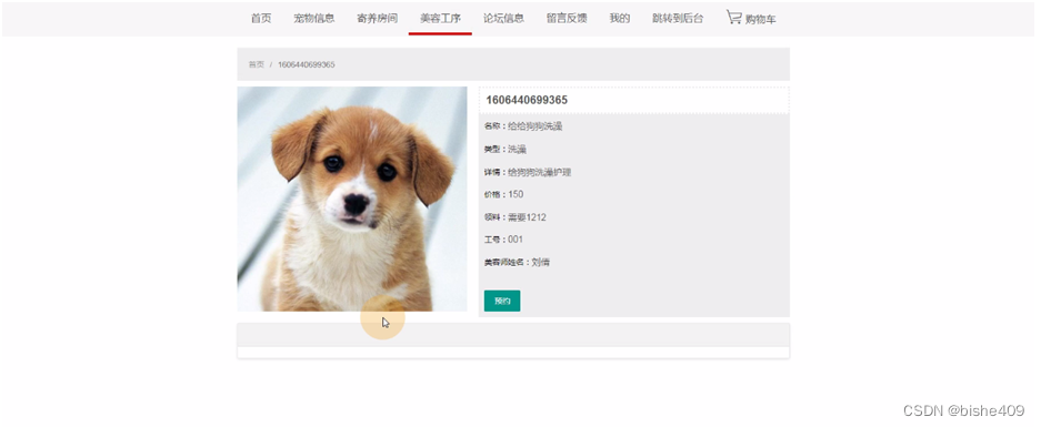 美容工序:通过页面可以获取编号、名称、类型、详情、价格、领料、工号、美容师姓名等信息,进行预约操作,如图5-6所示。