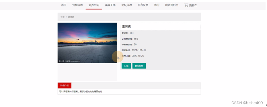 寄养房间:通过页面可以获取寄养房、房间号、图片、日租房价格、钟点房价格、咨询电话、发布日期、详细介绍等信息,进行日租、钟点租赁操作,如图5-5所示。