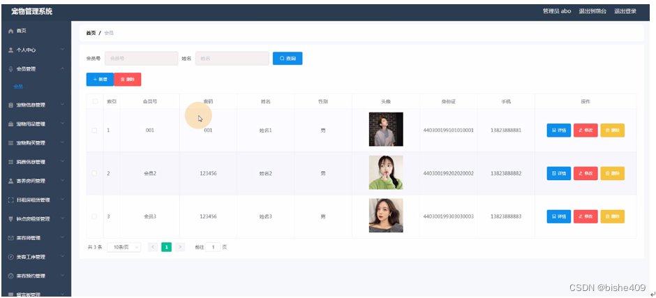 会员管理:通过列表可以获取索引、会员号、密码、姓名、性别、头像、身份证、手机等信息,进行详情、修改或删除操作,如图5-16所示。