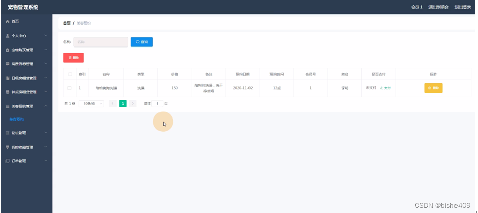 美容预约管理:通过列表可以获取索引、名称、类型、价格、备注、预约日期、预约时间、会员号、姓名、是否支付等信息进行删除操作,如图5-12所示。