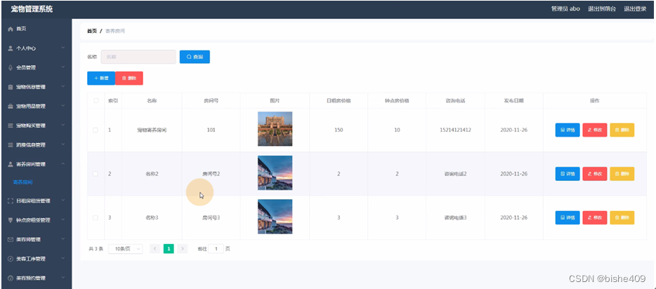 寄养房间管理:管理员通过列表可以获取索引、名称、房间号、图片、日租房价格、钟点房价格、咨询电话、发布日期等信息,进行修改或删除操作,如图5-20所示。