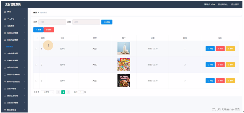 宠物用品管理:通过列表可以获取索引、名称、类型、图片、日期、价格等信息,进行修改或删除操作,如图5-18所示。