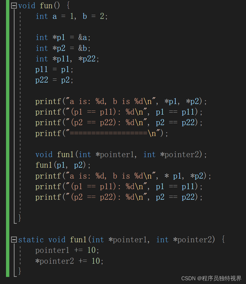 在上面的代码里,指针变量p1和p2传入到fun1()函数中去做运算之后,并没有发生变化,而b的值却发生了变化,有疑惑的自己敲代码运行一下看输出和心理预期有没有出入。