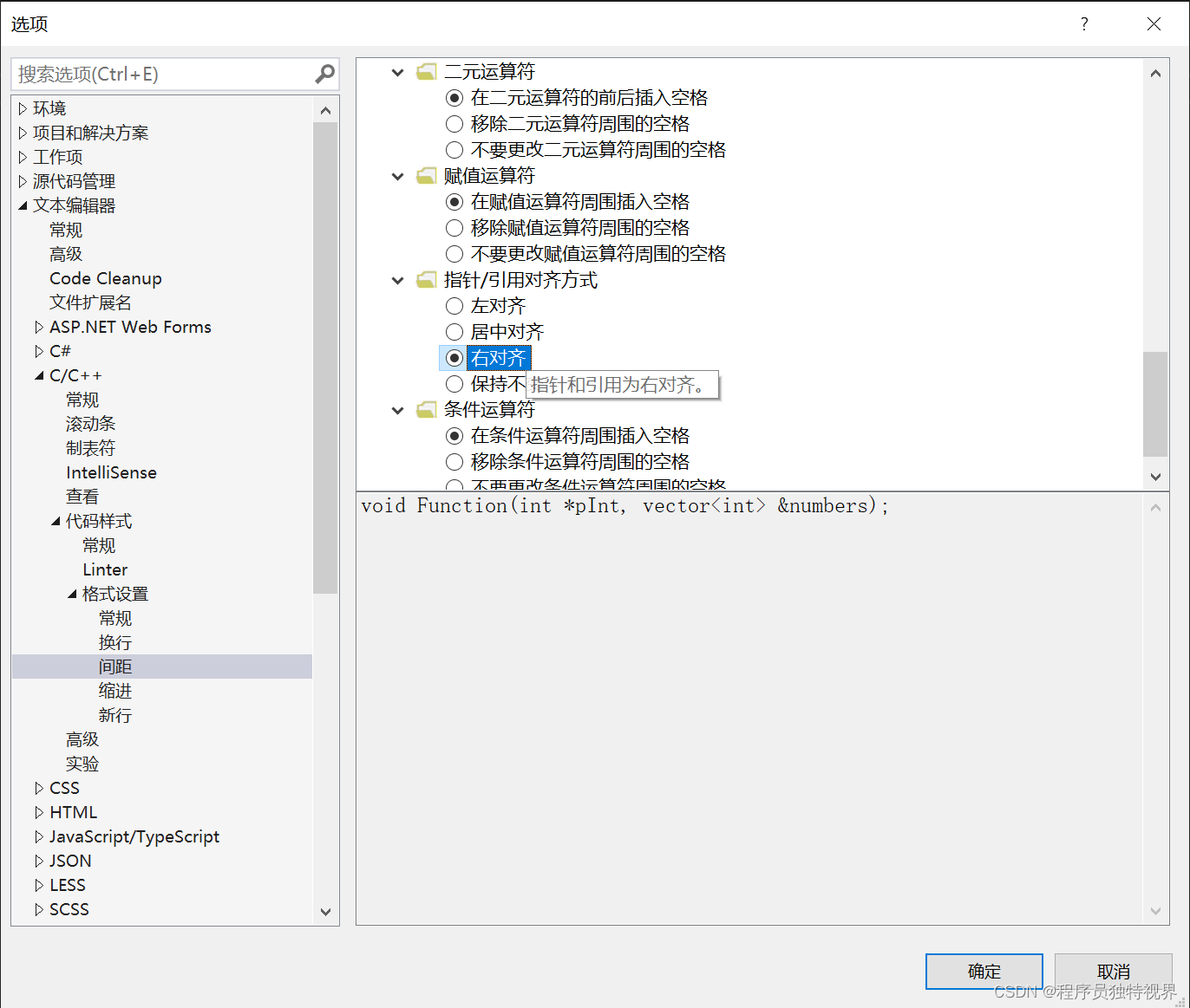 在Visual Studio里默认星号紧跟数据类型,想修改的话打开“工具”->“选项”进行调整如下: