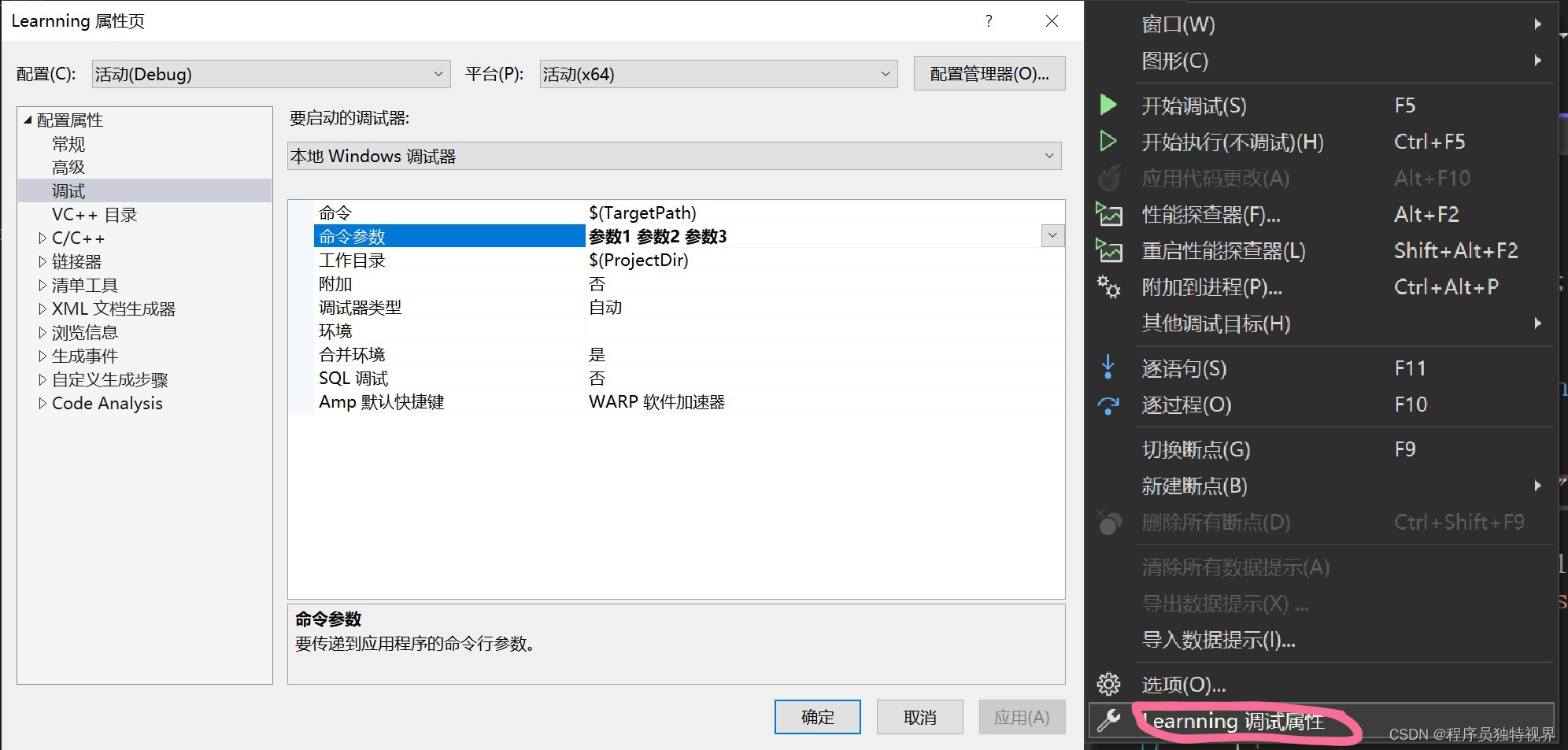 可以在Visual Studio的项目配置里添加调试参数,点击“调试”->“你的项目名+属性调试”(最下面一个菜单),如下图所示: