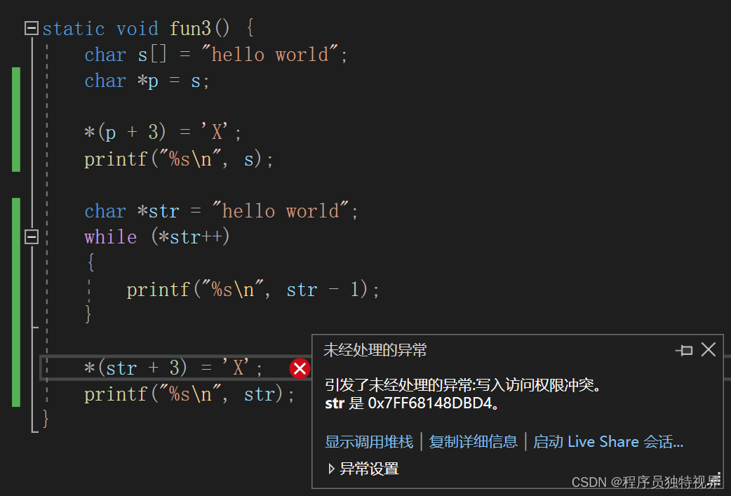 和数组指针类似,自身也可以做指针运算,引用字符串中某一个字符,或者改变字符串中某一个字符,但是注意直接赋值给指针变量的字符串是不能改变其中的字符的,如下代码: