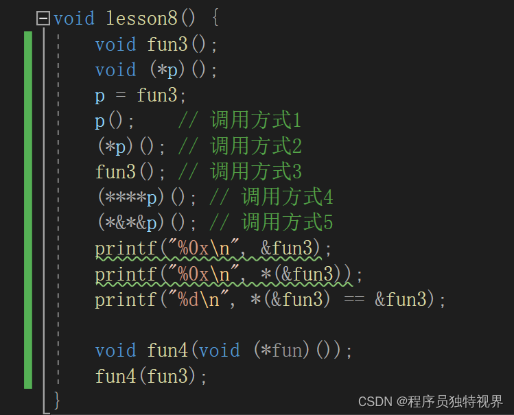 上面代码中的5种调用都能执行,而且结果一致,是不是有点疑惑呢?答案就在打印输出的地址中——指向函数的指针和函数里的指针是一致的。
