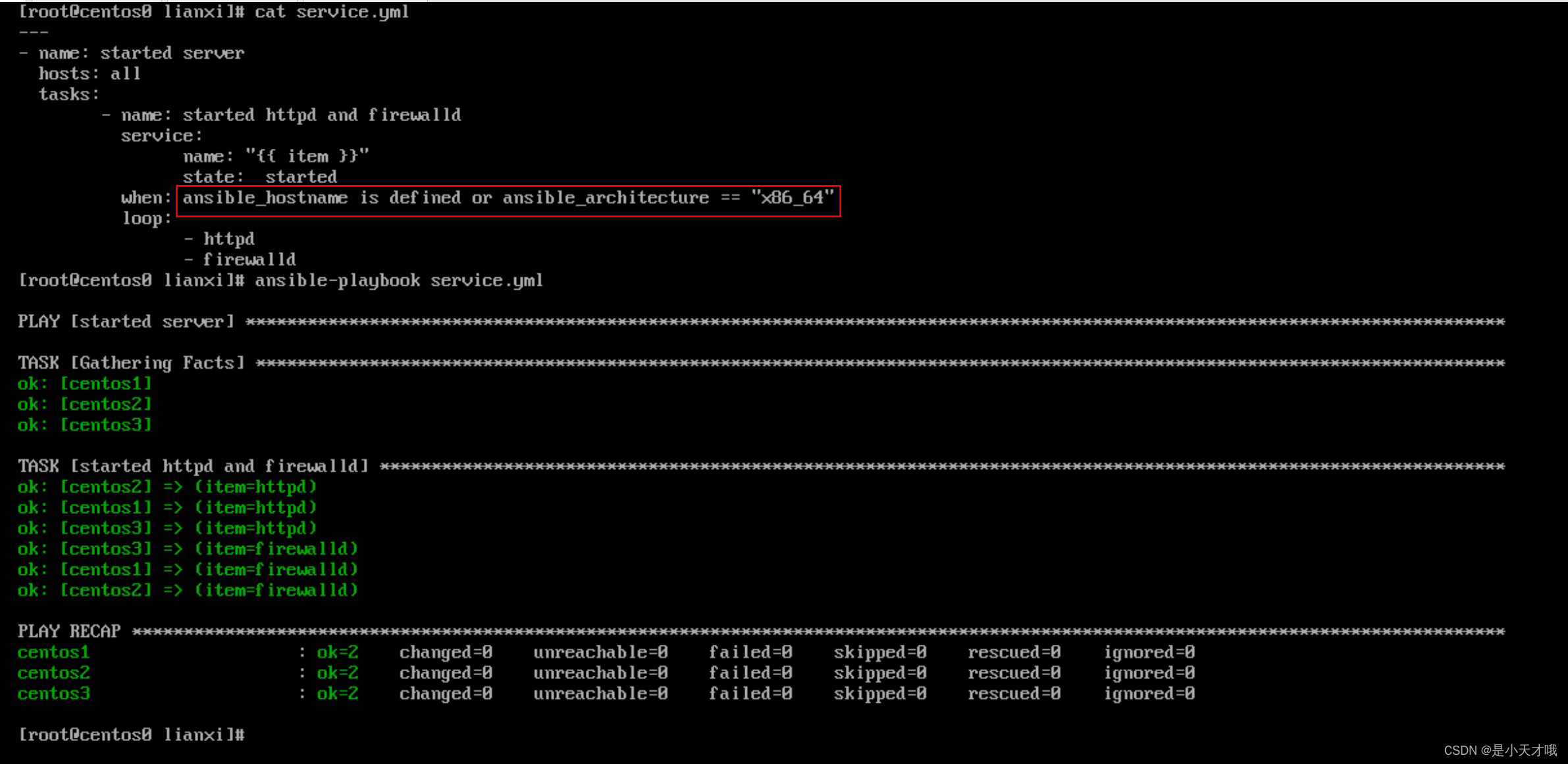 看第一个红色括号,我们使用 ansible_hostname is defined and ansible_architecture == "x86_64",只有当 变量 ansible_hostname 存在的同时 ansible_architecture 变量等于字符 x86_64才能执行service模块。
