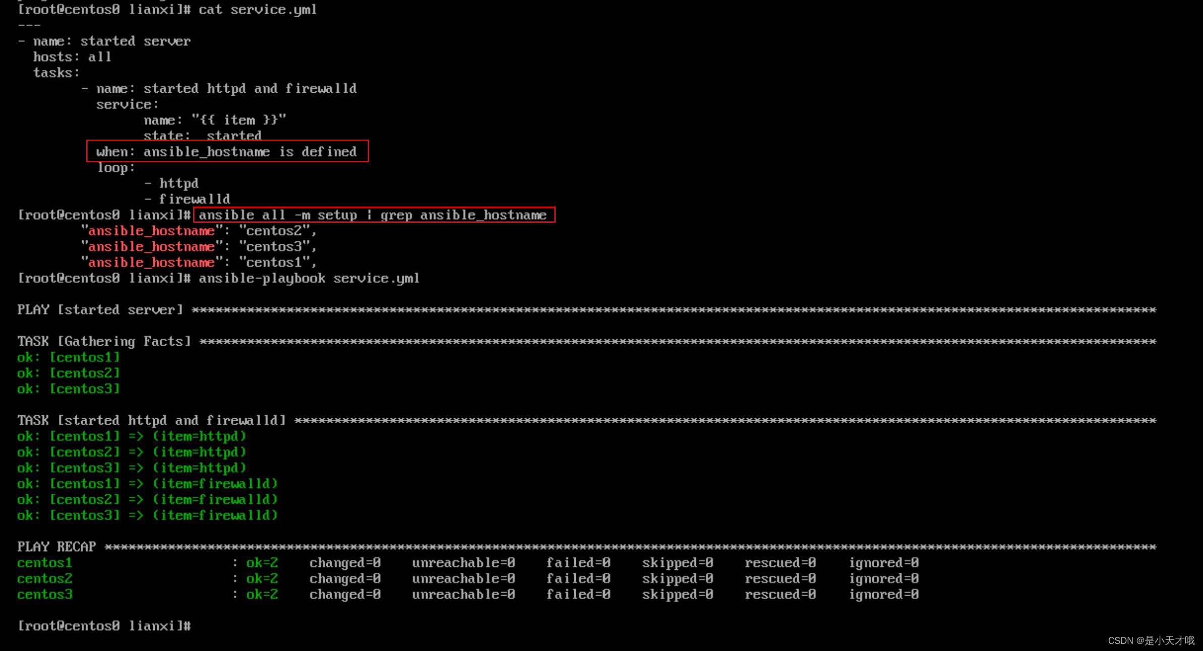 这里看到第一个红色括号,这里我们设置了一个 when的条件只有当变量 ansible_hostname 存在的时候才会执行上面的 service 模块,而第二个红色括号我们使用 ansible all -m setup | grep ansible_hostname 确立三台主机确实都存在这个变量(ansible all -m setup 可以直接获得所有受空主机的事实)