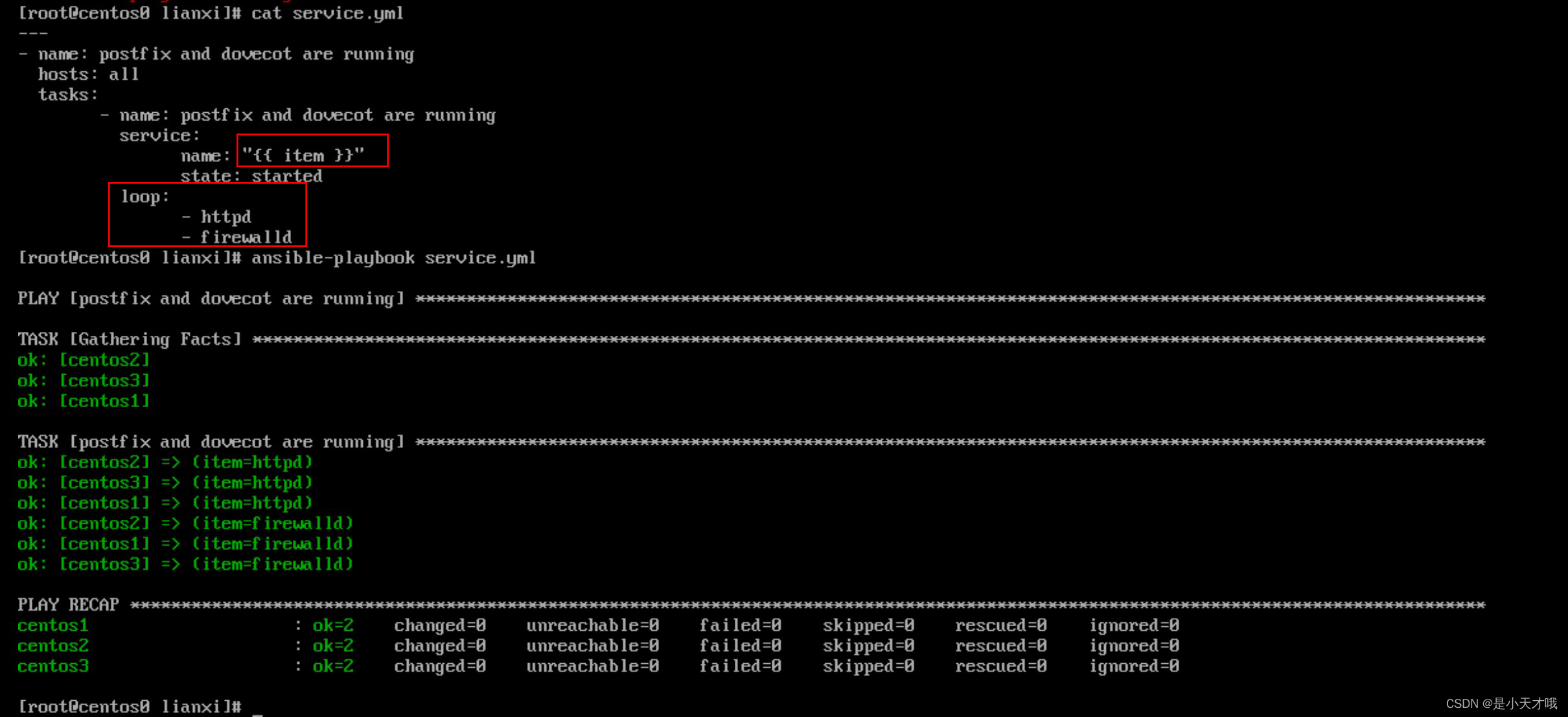 这里先看第二个红色括号,我的loop包含了两个关键值,分别是 httpd,firewalld ,然后这两个关键值都会被分别引入到第一个红括号当中的 item 变量当中去。