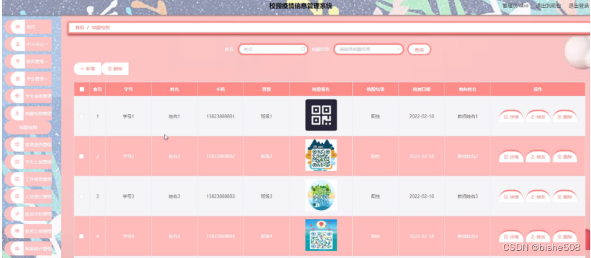 核酸检测管理,在核酸检测管理页面可以对学号、姓名、手机、班级、核酸报告、核酸结果、检测日期、教师姓名等内容进行修改和删除等操作,如图5-12所示。