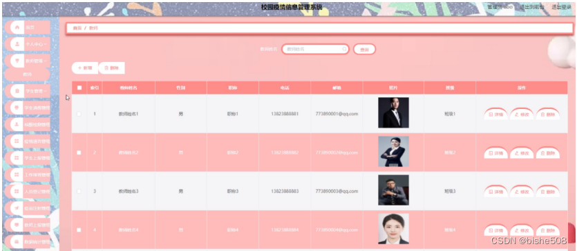教师管理,在教师管理页面可以对教师姓名、性别、职称、电话、邮箱、照片、班级等内容进行详情、修改和删除等操作,如图5-9所示。