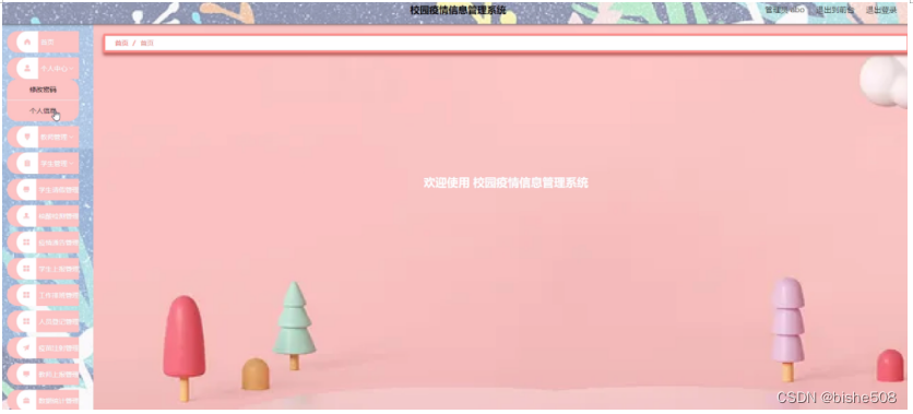 管理员登录系统后,可以对首页、个人中心、教师管理、学生管理、学生请假管理、核酸检测管理、疫情通告管理、学生上报管理、工作排班管理、人员登记管理、疫苗注射管理、教师上报管理、数据统计管理、视频类型管理、预防视频管理、管理员管理、系统管理等进行相应的操作管理,如图5-8所示。
