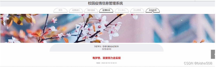 本校园疫情信息管理系统以用户需求为目标,以方便使用本系统的用户为原则,同时加入一些先进的设计理念。根据用户不同的需求制作一个操作界面简单、模块功能完善、便于管理的平台,能够充分的满足用户的需求并方便于本网站的管理人员对网站实行管理。
