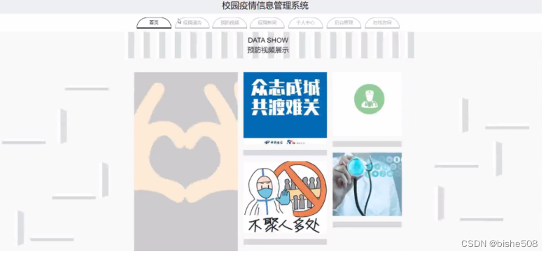 网站首页页面主要包括首页、疫情通告、预防视频、疫情新闻、个人中心、后台管理、在线咨询等内容,并根据需要进行详细操作;如图5-1所示: