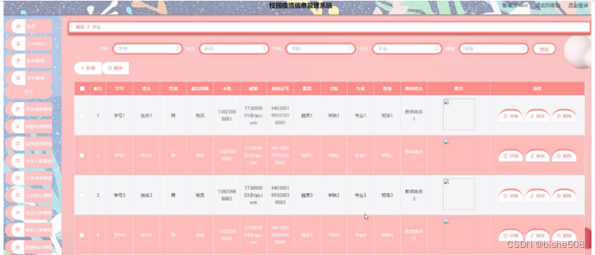 学生管理,在学生管理页面可以对学号、姓名、性别、政治面貌、手机、邮箱、身份证号、籍贯、学院、专业、班级、教师姓名、照片等内容进行详情、修改、删除等操作,如图5-10所示。