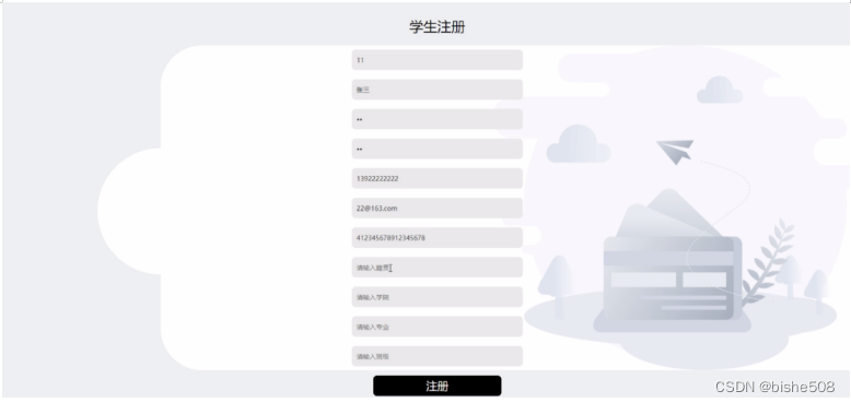 学生注册,在学生注册页面通过填写学号、姓名、密码、手机、邮箱、身份证号、籍贯、学院、专业、班级等信息完成学生注册操作,如图5-2所示。