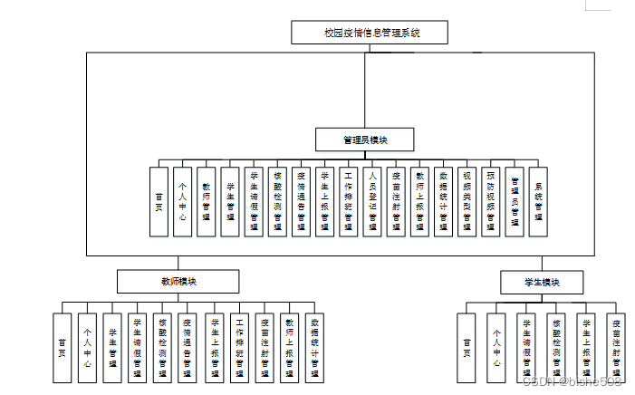 整个校园疫情信息管理系统为了便于学生查看、教师添加与管理员管理,采用了以下几大功能管理模块,包括管理员与学生、教师的设计: