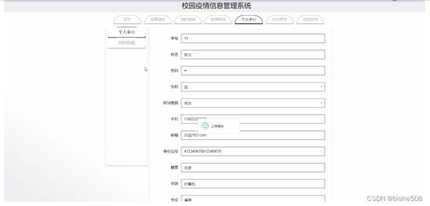 个人中心,在个人中心页面填写学号、姓名、密码、性别、政治面貌、手机、邮箱、身份证号、籍贯、学院、专业、班级、教师姓名、照片等信息进行更新信息,还可以根据需要对我的收藏进行相对应操作,如图5-6所示。