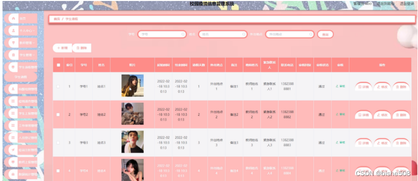 学生请假管理,在学生请假管理页面可以对学号、姓名、照片、起始时间、结束时间、请假天数、外出地点、备注、教师姓名、紧急联系人、联系电话、审核回复、审核状态、审核等内容进行修改和删除等操作,如图5-11所示。