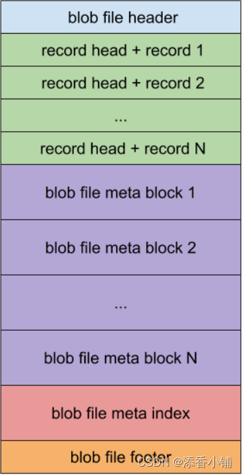 BlobFile 由 blob record 、meta block、meta index block 和 footer 组成。其中每个 blob record 用于存放一个 key-value 对;meta block 支持可扩展性,可以用来存放和 BlobFile 相关的一些属性;meta index block 用于检索 meta block。
