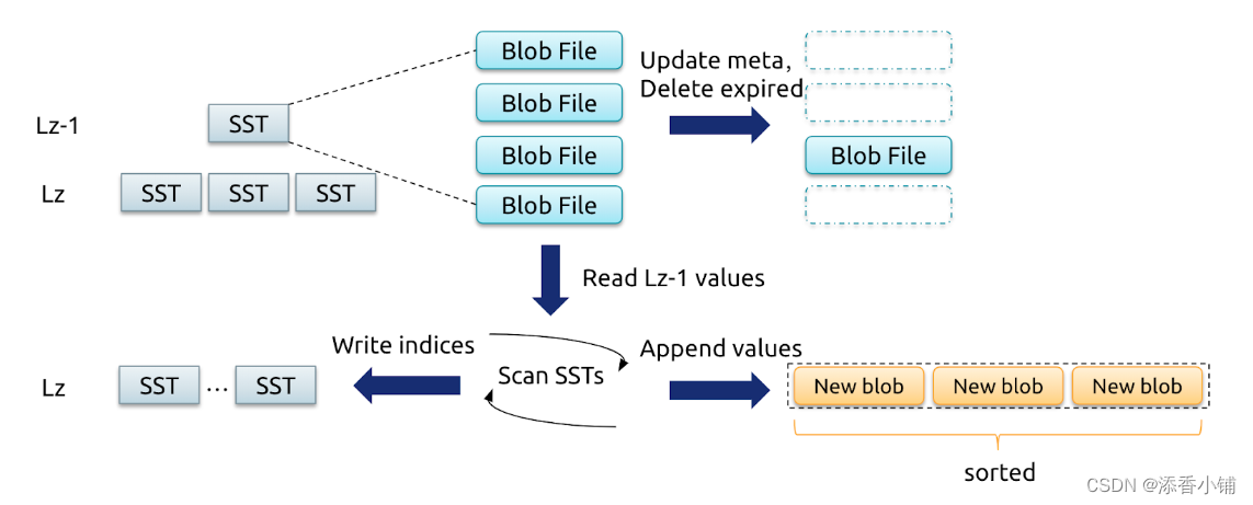 Level z-1 和 Level z 的 SST 进行 Compaction 时会对 KV 对有序读写一遍,这时就可以对这些 SST 中所涉及的 BlobFile 的 value 有序写到新的 BlobFile 中,并在生成新的 SST 时将 key 的 blob index 进行更新。对于 Compaction 中被删除的 key,相应的 value 也不会写到新的 BlobFile 中,相当于完成了 GC。