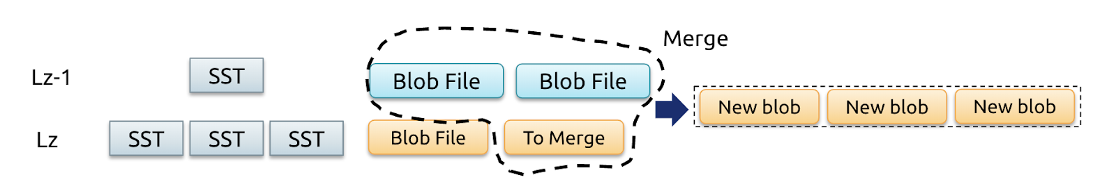 因此需要通过 Range Merge 操作维持 sorted run 在一定水平,即在 OnCompactionComplete 时统计该 range 的 sorted run 数量,若数量过多则将涉及的 BlobFile 标记为 ToMerge,在下一次的 Compaction 中进行重写。
