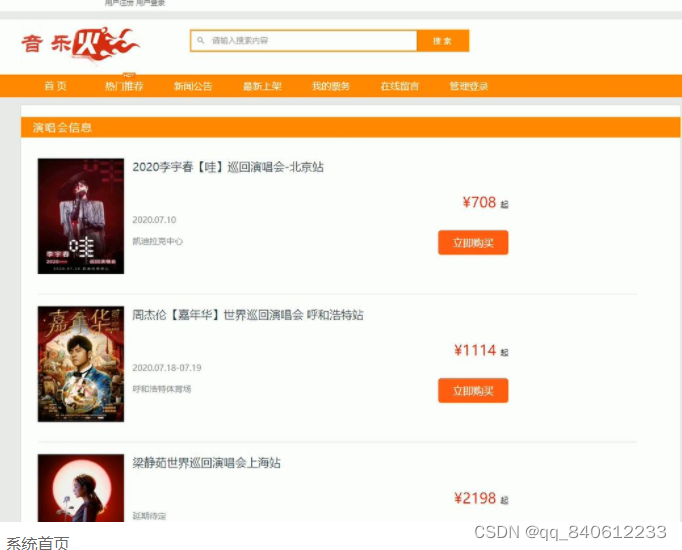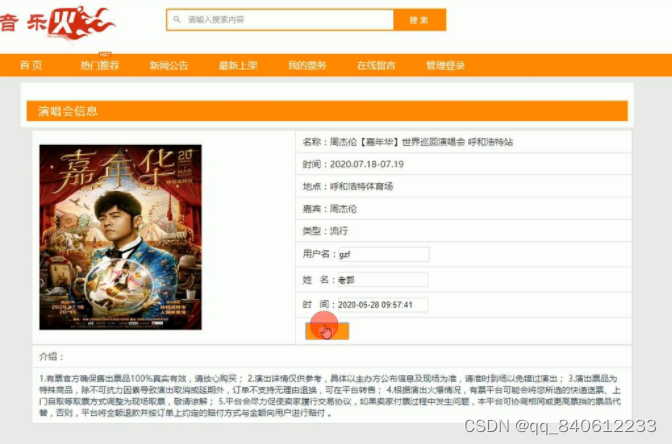 随着人们精神世界不断的追求,越来越多的演唱会出现在了各大城市中,但是很多时候因为歌迷们的区域限制等问题并不能够到实地进行买票,这就需要开发一套基于互联网的演唱会管理平台,并提供推荐算法让歌迷们选择更加适合自己的演唱会信息。