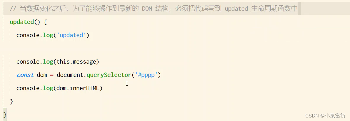mounted 函数:该函数是最早的的渲染好页面,需要操作DOM 中的元素最早只能在 mounted 中进行操作 。(操作 DOM 元素)