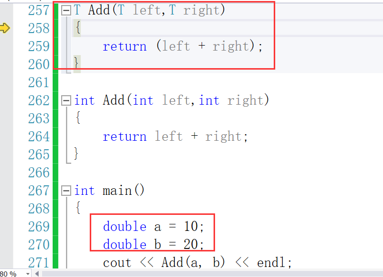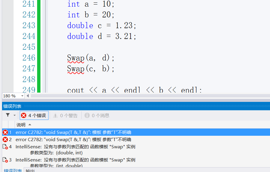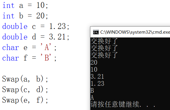 template <typename T> void Swap(T left, T right) { T tmp = left; left = right; right = tmp; cout << "交换好了" << endl; } int main() { int a = 10; int b = 20; double c = 1.23; double d = 3.21; Swap<int>(a,d); Swap<double>(b, c); cout << a << endl << b << endl; cout << c << endl << d << endl; return 0; }