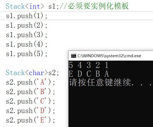 int main() { try//对new进行异常判断 { Stack<int> s1;//必须要实例化模板 s1.push(1); s1.push(2); s1.push(3); s1.push(4); s1.push(5); Stack<char>s2; s2.push('A'); s2.push('B'); s2.push('C'); s2.push('D'); s2.push('E'); while (!s1.Empty())//栈判空 { cout << s1.Top() << " "; s1.Pop(); } cout << endl; while (!s2.Empty())//栈判空 { cout << s2.Top() << " "; s2.Pop(); } cout << endl; } catch (exception& e)//捕获异常 { cout << e.what() << endl; } return 0; }