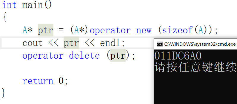 class A { public: A(int a = 123) : _a(a) { cout << "A():" << this << endl; } ~A() { cout << "~A():" << this << endl; } private: int _a; }; int main() { A* ptr = (A*)malloc(sizeof(A)); A* ptr1 = (A*)malloc(sizeof(A)); new(ptr)A(); new(ptr1)A(222); ptr->~A(); free(ptr); operator delete (ptr1); return 0; }