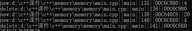 // 重载operator delete void* operator new(size_t size, const char* fileName, const char* funcName, size_t lineNo) { void* p = ::operator new(size); cout << "new:" << fileName << "||" << funcName << "||" << lineNo << "||" << p << "||" << size << endl; return p; } // 重载operator delete void operator delete(void* p, const char* fileName, const char* funcName, size_t lineNo) { cout << "delete:" << fileName << "||" << funcName << "||" << lineNo << "||" << p << endl; ::operator delete(p); } //用宏进行operator new/delete进行简化 #ifdef _DEBUG #define new new(__FILE__, __FUNCTION__, __LINE__) #define delete(p) operator delete(p, __FILE__, __FUNCTION__, __LINE__) #endif int main() { A* p1 = new A; delete (p1); A* p2 = new A[4]; A* p3 = new A; delete (p3); return 0; }C/C++提供了三个宏__FUNCTION__,_FILE_和_LINE_定位程序运行时的错误。程序预编译时预编译器将用所在的函数名,文件名和行号替换。当运行时错误产生后这三个宏分别能返回错误所在的函数,所在的文件名和所在的行号。