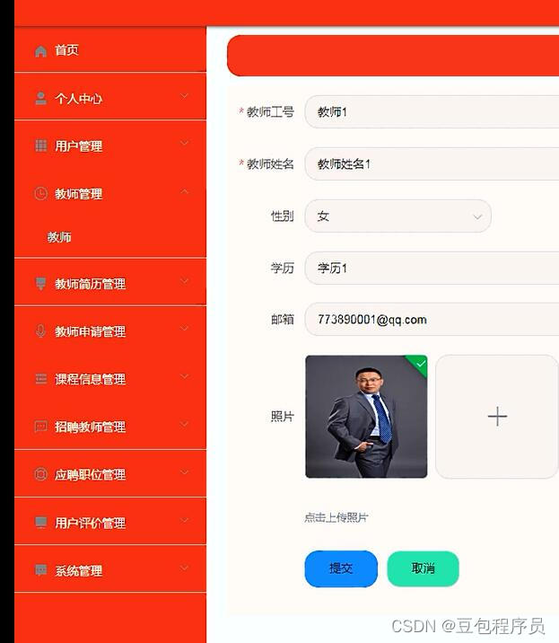 管理员权限如下;首页、个人中心、用户管理、教师管理、教师简历管理、教师申请管理、课程信息管理、招聘教师管理、应聘职位管理、用户评价管理、系统管理;教师后台;