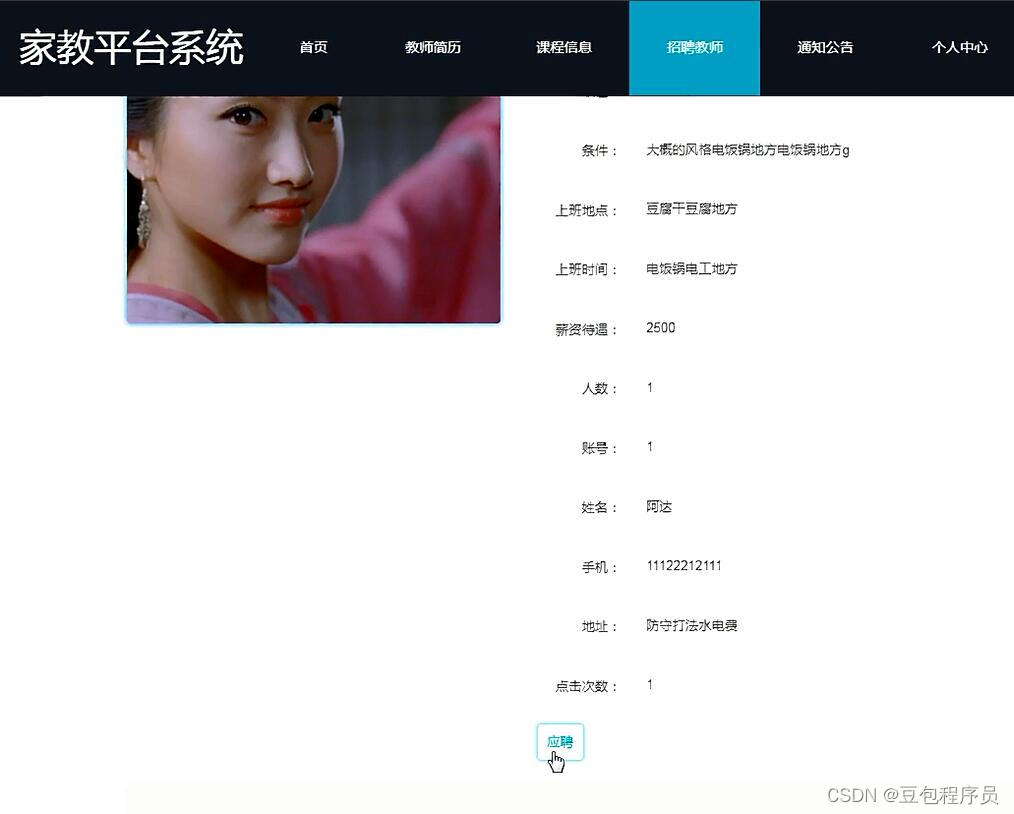 用户后台;首页、个人中心、教师申请管理、招聘教师管理、应聘职位管理、用户评价管理等功能。通过这些功能模块的设计,基本上实现了整个家教平台系统的过程。