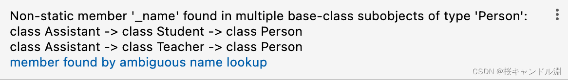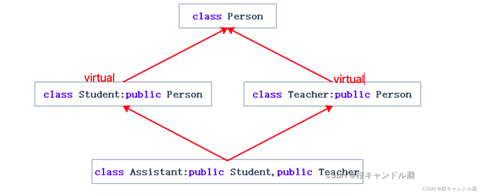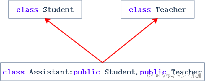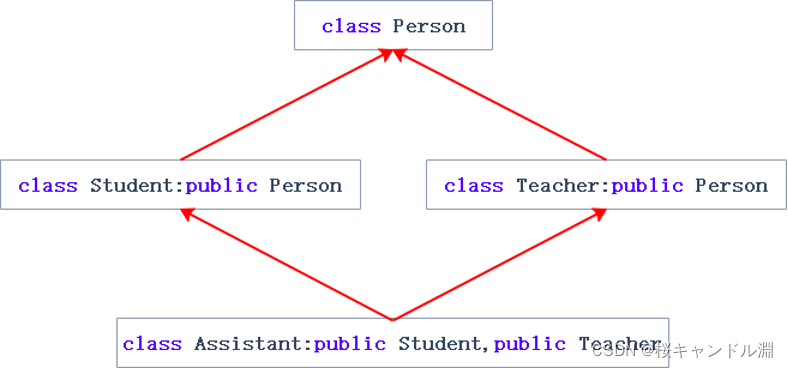 二义性:这里我们的助教既是学生,又是老师,那其继承的Person类中就不知道这个Person类应该是用学生类中的Person还是老师类中的Person了。
