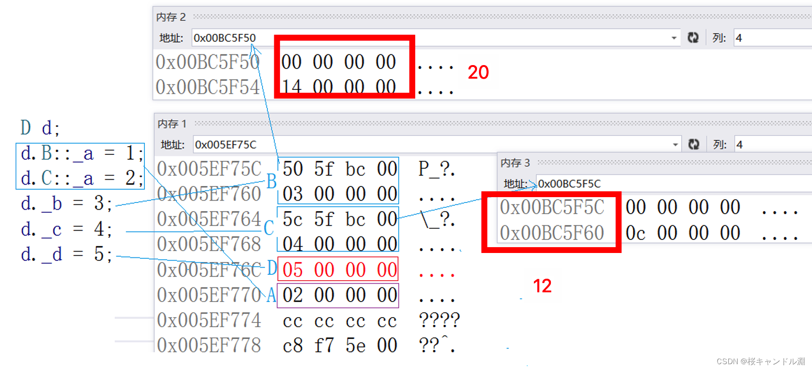 然后我们的B的地址加上20(一行是4字节,一共是5行),找到我们的A类的地址