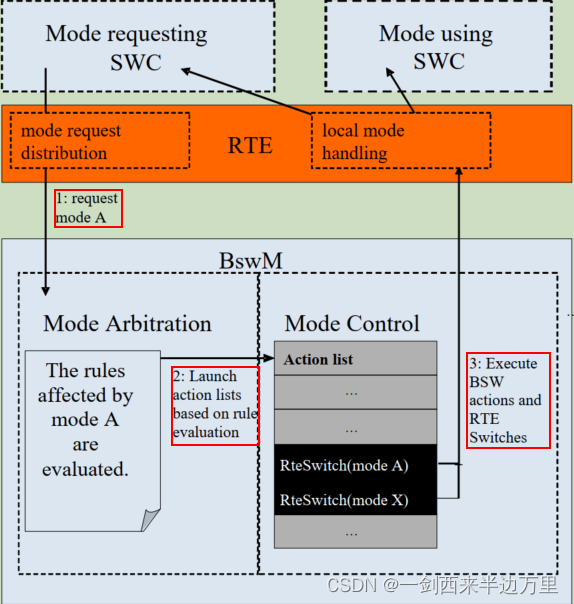 4)、在执行动作列表时,BswM可能会向RTE Switch API发出一个或多个调用,作为动作,将仲裁结果通知受影响的SWC。任何SW-C,特别是模式请求者都可以注册以接收模式切换指示。