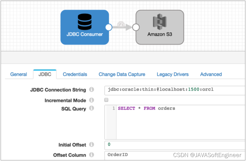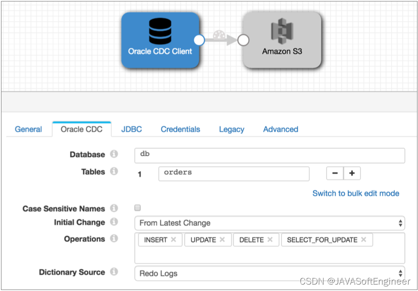 请注意,Oracle CDC 客户端进程仅更改捕获数据。如果需要现有数据,则可以在启动 Oracle CDC 客户端管道之前,在单独的管道中使用 JDBC 查询使用者或 JDBC 多表使用者来读取表数据。