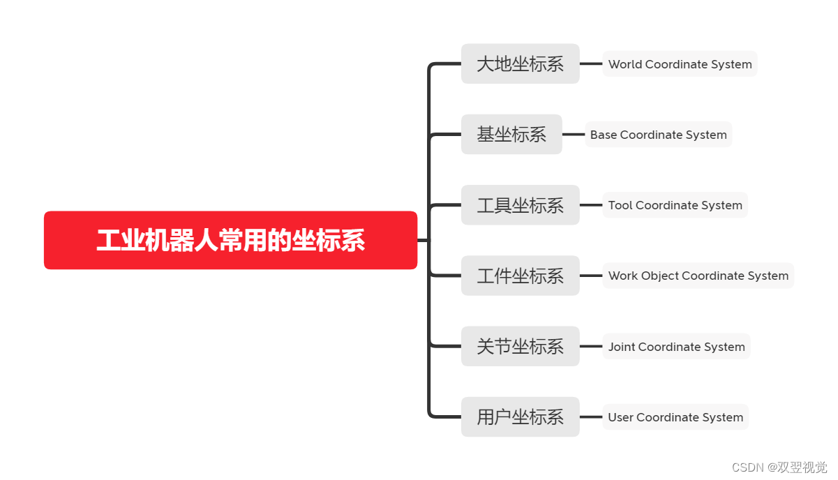 工具坐标系:固定在工具(法兰、装在法兰上的工具)上的坐标系