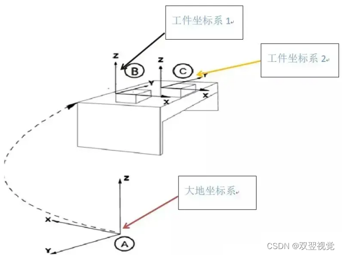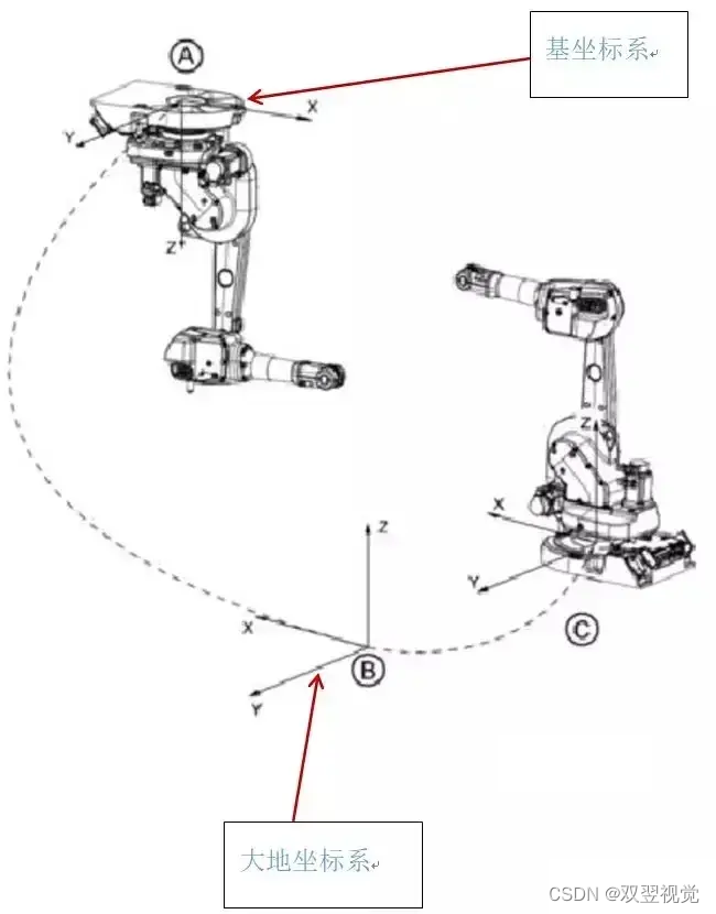 大地坐标系:大地坐标系是以大地作为参考的直角坐标系。在多个机器人联动的和带有外轴的机器人会用到,90%的大地坐标系与基坐标系是重合的。但是在以下两种情况大地坐标系与基坐标系不重合: