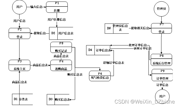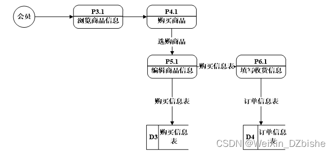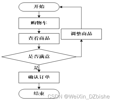 根据系统的功能需求,再分析该系统的业务流程,用户登录系统购买商品,先将商品加入至购买记录,然后对购买记录做调整,接着生成订单,订单生成后,在线支付金额,管理员管理商品,管理用户的订单。